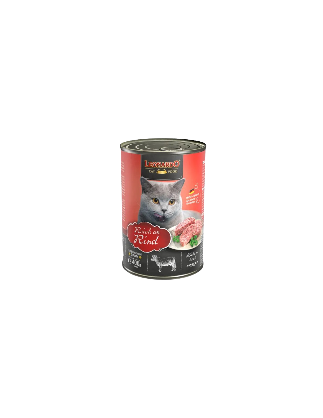 Leonardo ric en vedella 400 gr. Menjar Humit Quality Selection de vedella (25%) amb brou de carn (34%) i minerals (0,5%)