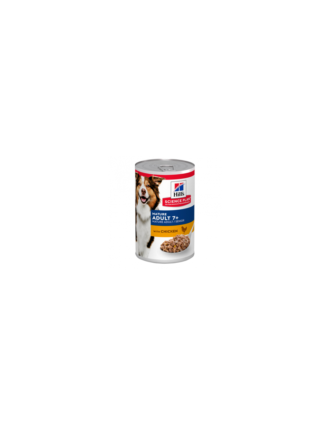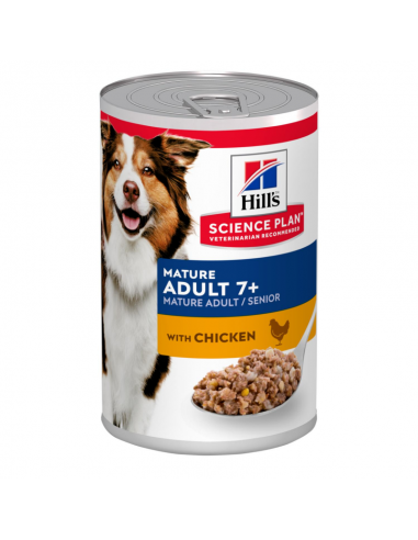Lata Hill's Science Plan Mature Adult de pollo, para perros mayores a los 7 años.